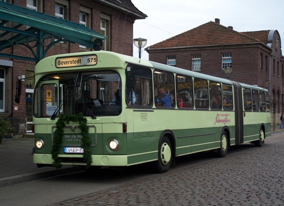Es dürfte bundesweit die letzte Linienfahrt eines MAN SG 192 gewesen sein, die am 28.11.2008 von der Firma Giese aus Beverstedt durchgeführt wurde. Das Unternehmen stellte den letzten Bus von ehemals fünf baugleichen Fahrzeugen endgültig ab. Der Wagen war erst zwei Jahre zuvor aufwendig instandgesetzt worden. In Rahmen der Blecharbeiten wurde auch die Lackierung in den Hausfarben des Unternehmens vorgenommen. |