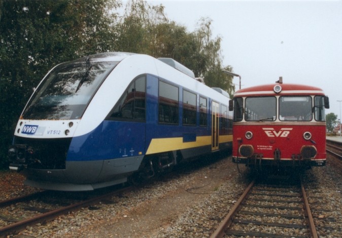 Die Eisenbahnen und Verkehrsbetriebe Elbe-Weser GmbH (EVB) hat es vorgemacht: mit einem attraktiven Angebot im schienengebundenen Nahverkehr lockt sie immer mehr Kunden an. Von der Deutschen Bundesbahn war die eingleisige Nebenstrecke von Bremerhaven nach Stade wie so viele andere in Deutschland zuletzt stiefmütterlich behandelt worden. Die Übernahme von DB-Strecken im Elbe-Weser-Raum durch die Privatbahn war die letzte Rettung. Moderne Triebwagen der DB-Baureihe 628, die vertaktet auf einer neuen Streckenführung zwischen Bremerhaven und Hamburg-Neugraben eingesetzt werden, trugen zum Erfolg bei. Auf den Strecken Bremen - Delmenhorst - Osnabrück, Wilhelmshaven - Oldenburg - Osnabrück und Esens - Sande - Wilhelmshaven weht nun ebenfalls ein neuer Wind. Nach Ausschreibung der Strecken kam die neugegründete Nordwestbahn mit Sitz in Osnabrück im wahrsten Sinne des Wortes zum Zuge. Dreiundzwanzig moderne Triebwagen vom Typ EBO LINT 41 des Herstellers Alstom LHB bedienen nach ein paar Startschwierigkeiten zuverlässig die genannten Strecken. Das Foto zeigt Fahrzeuge beider Bahnen und spiegelt gleichzeitig den technischen Fortschritt wider. Das Stelldichein des modernen Nordwestbahn-Triebwagens mit dem EVB-Oldtimer der Baureihe VT 795 wurde am 7. Oktober 2000 in Bremervörde aufgenommen. Es war möglich, weil die EVB aufgrund von Revisionen an den Fahrzeugen der Baureihe 628 zwei Triebwagen von der NWB ausgeliehen hatte. |