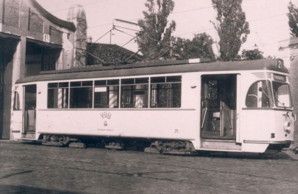 Triebwagen 71 vor der Fahrzeughalle des Betriebshofs Wurster Straße (hm).
